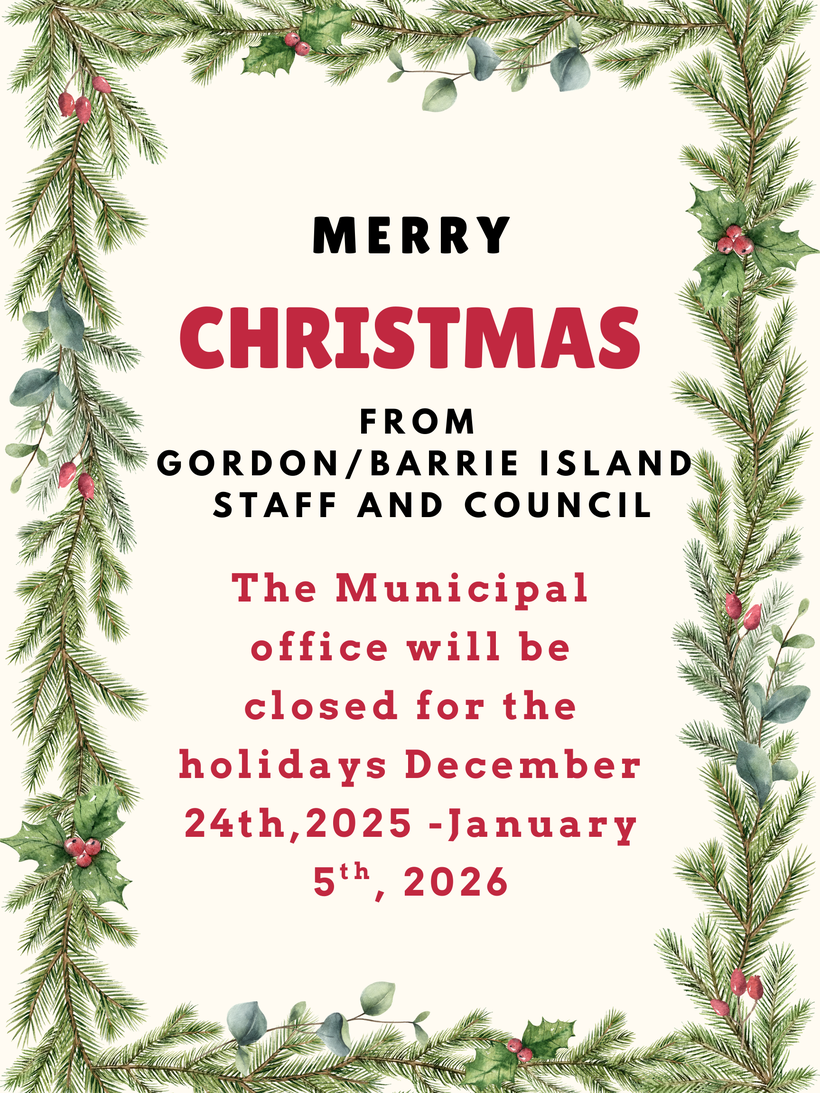 * The next Council Meeting will be at 7:00pm on January 13th, 2026 at the Gordon/Barrie Island office on 29 Noble Sideroad.