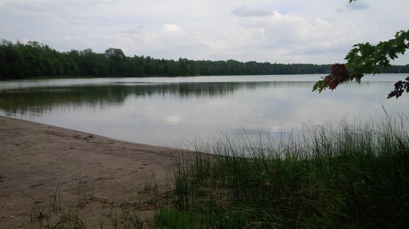 To find this secluded beach on Tobacco Lake, one needs to drive south along Highway 542 from Highway 540 (at the OPP station), and drive a few minutes until you reach Golf Course Rd. Here turn right and drive a half minute until you reach Ida's Rd. Turn left and there is parking on the left right beside the beach. There are picnic tables and a sandy beach. And the water is warm mid-summer!