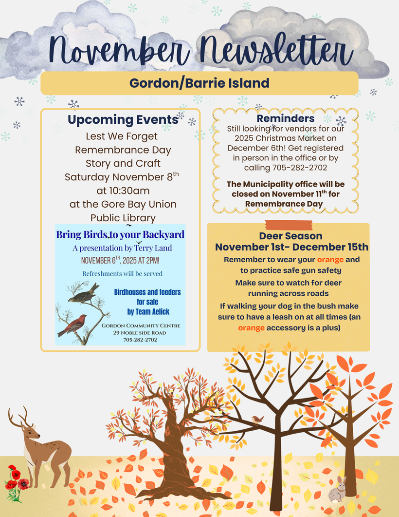 Restarting the publication of the newsletter, this edition was the first. Included is an introduction to many of the new staff that have joined the Gordon/Barrie Island team. Also, other announcements from the office of Carrie Lewis, Chief Municipal Officer for the municipality.