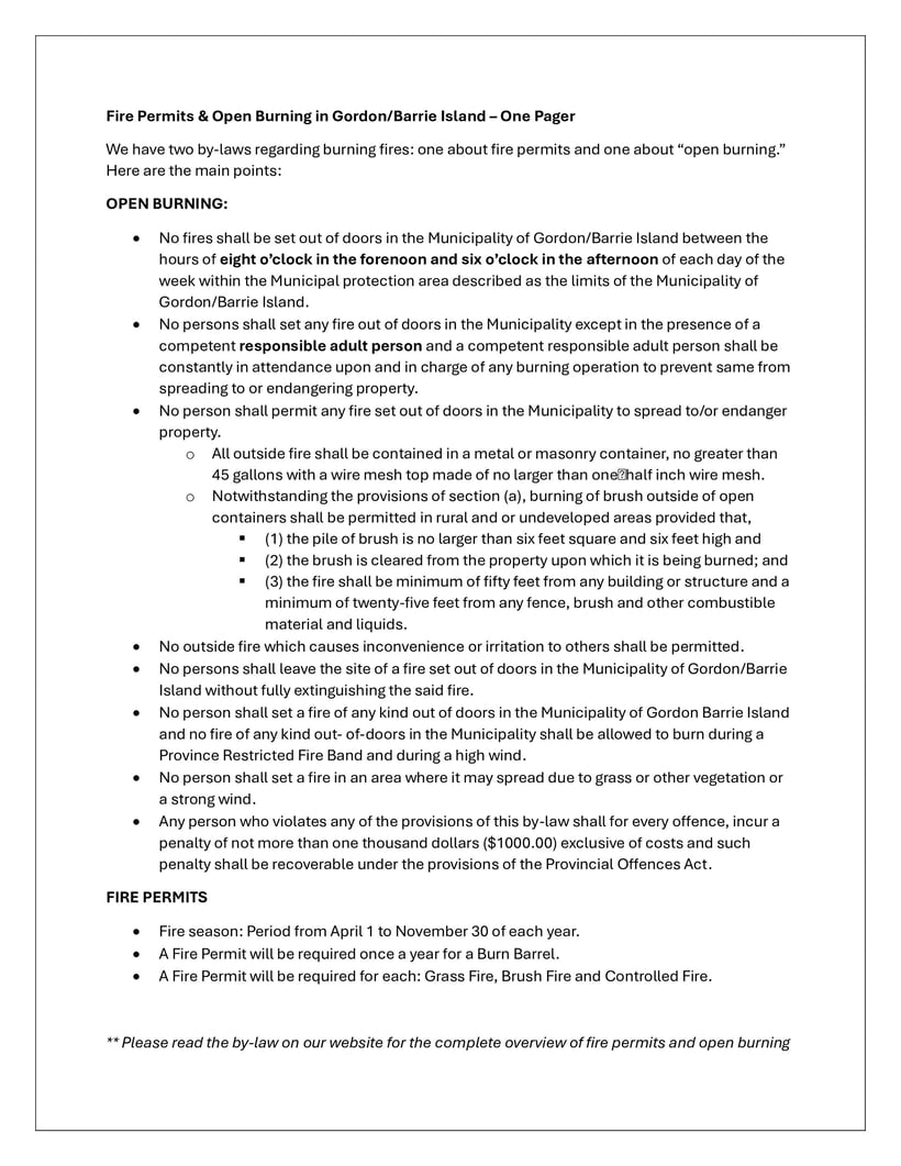 The fire department plays a vital role in the safety and protection of the residents of Gordon/Barrie Island. Fire Chief Addison manages a crew of 20 volunteer firefighters that serves both the municipalities of Gordon/Barrie Island and the Town of Gore Bay. The crew are trained in first aid, emergency service and fire fighting. These men and women are on the front lines of protecting residents from dangers in a very wide array of emergency situations. They are the first responders who keep us safe.